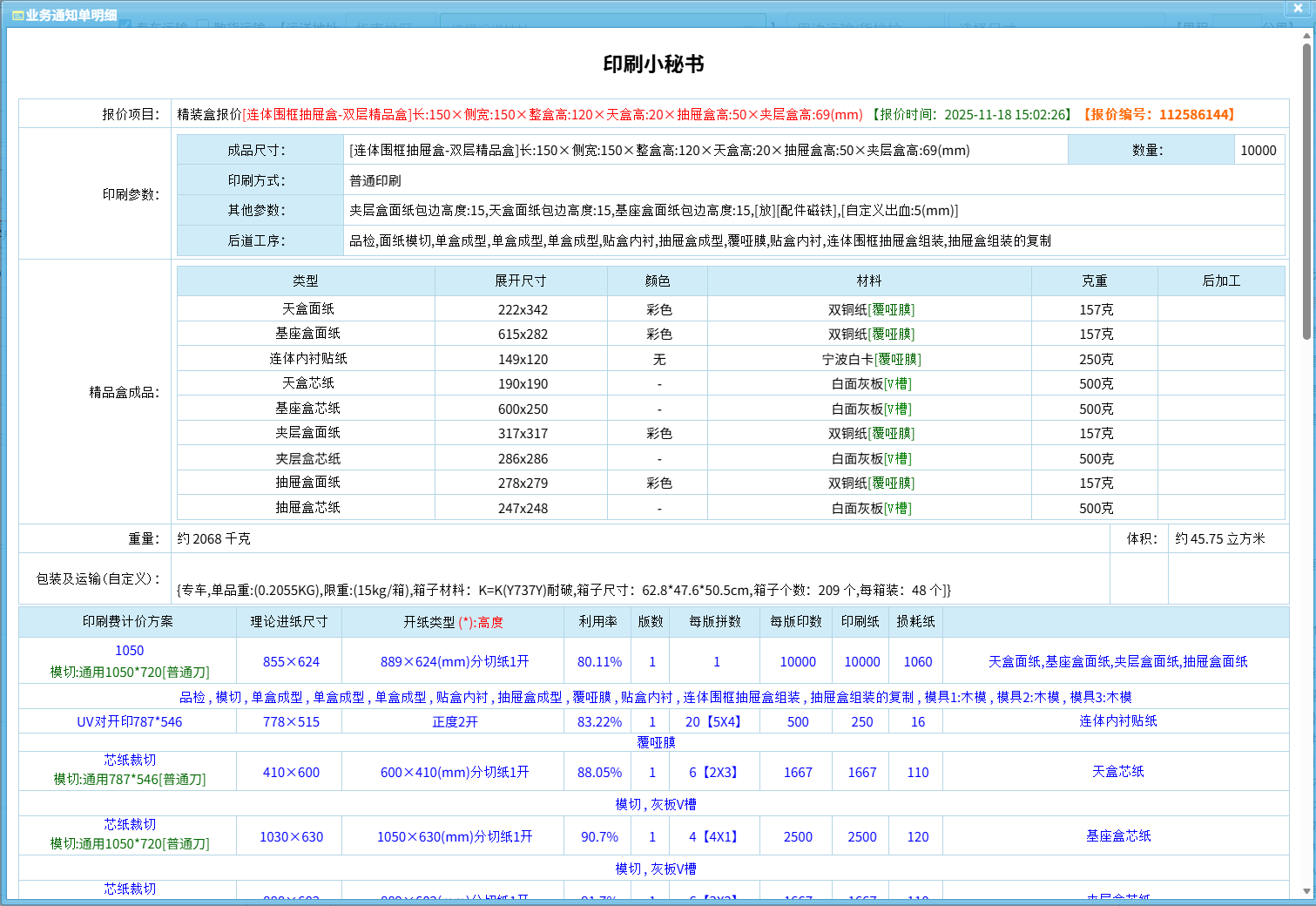除了报价单和价格明细外,小秘书报价软件还会同步生成的不含价格的业务通知单。这份通知单完整记录了所报价盒型的结构、材质、印刷工艺、表面处理及所有后道要求。它作为业务