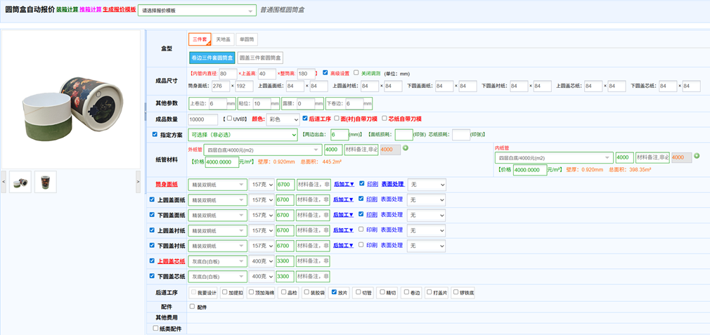 (1)全覆盖的盒型支持:功能支持市场主流的圆筒盒类型,无论是三件套、两件套还是单圆筒,无论是卷边工艺还是平边设计,系统均已内置对应的报价模板,用户只需按需选择即可。