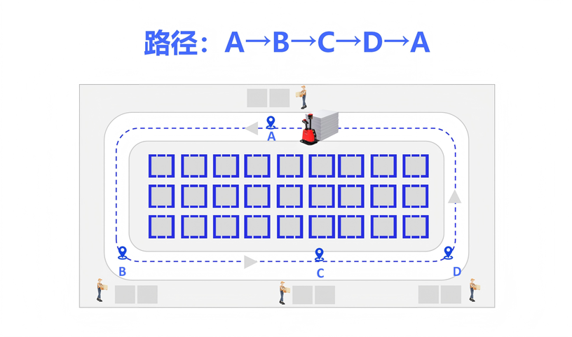 而对于印刷包装厂最有挑战性的“多工序衔接”场景,迅越AGV的公交车循环模式就能发挥最大作用。它像厂区里的“固定公交”,按预设路线在各个关键工序工位之间循环停靠,模切后