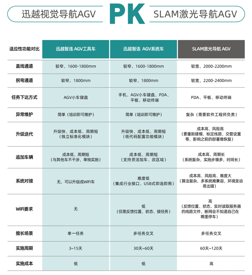 技术适配为王:在窄通道(<2米)、设备密集的场景下,视觉导航AGV的实用性和稳定性通常优于激光导航。它将部署复杂度从“土木工程”降级为“粘贴作业”,优势显著。